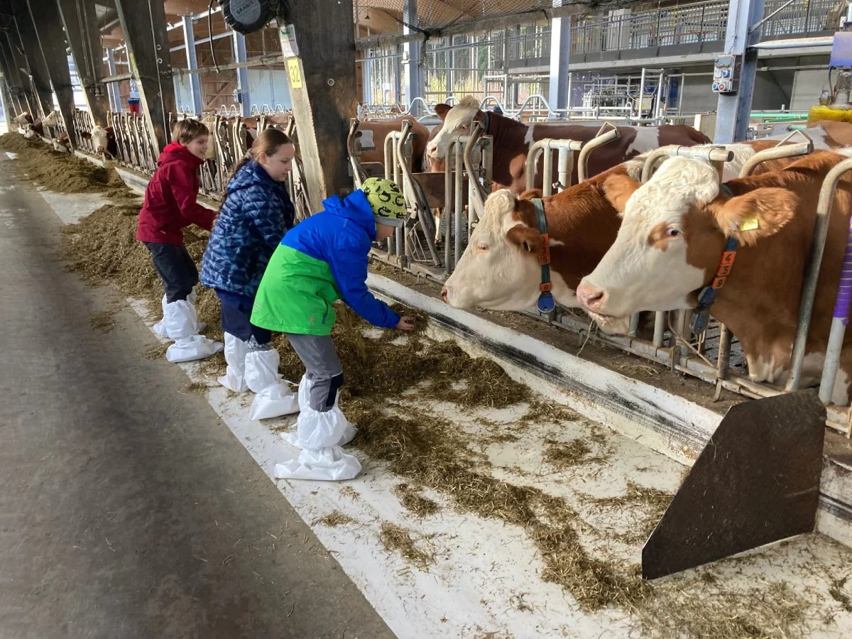 Passend zum Thema „Das Rind“, das gerade im Biologie-Unterricht bearbeitet wird, dürfte die 5.Klasse gemeinsam mit Frau Hofmann und Frau Sandmaier einen Besuch zum LAZBW Aulendorf in den großen Kuhstall machen. Dort lernte die Klasse, wie viel Milch eine Kuh gibt und wie sie gemolken wird. Zudem kamen die Kinder im Stall in direkten Kontakt mit den Kühen und einige Mutige durften die Kühe sogar streicheln und füttern. Zuletzt untersuchten die Schülerinnen und Schüler, welches Futter eine Kuh frisst und wie dieses Futter von der Kuh verdaut wird. Am Ende gab es eine leckere Kostprobe der frischen Milch.