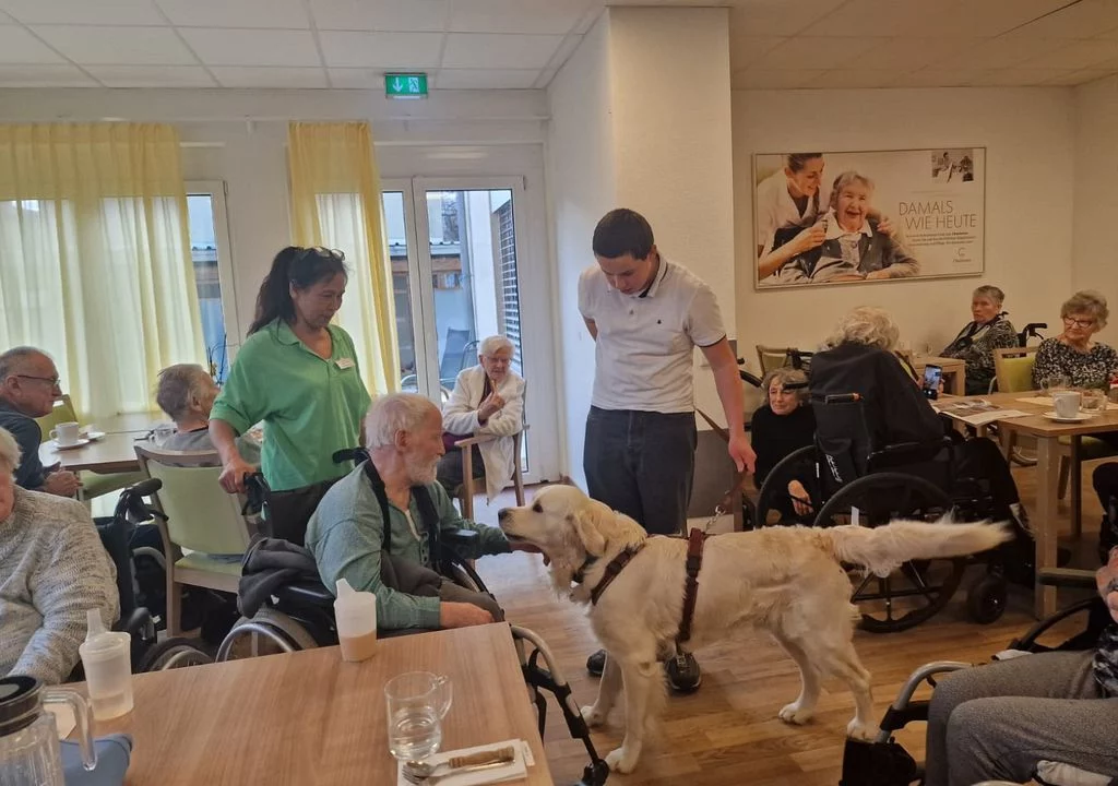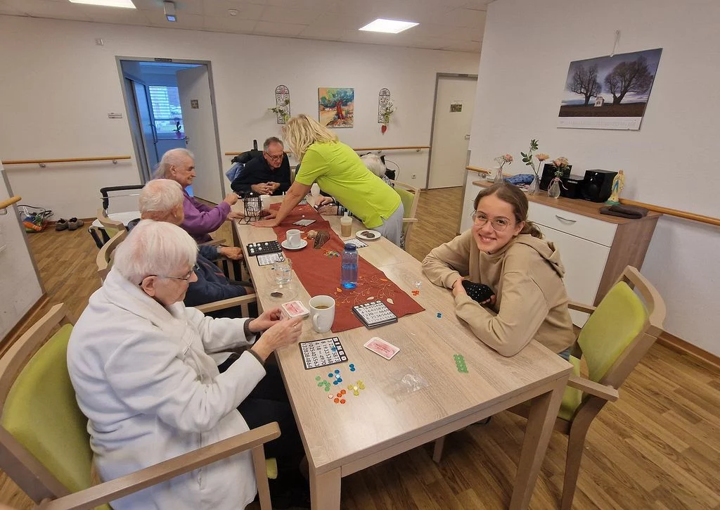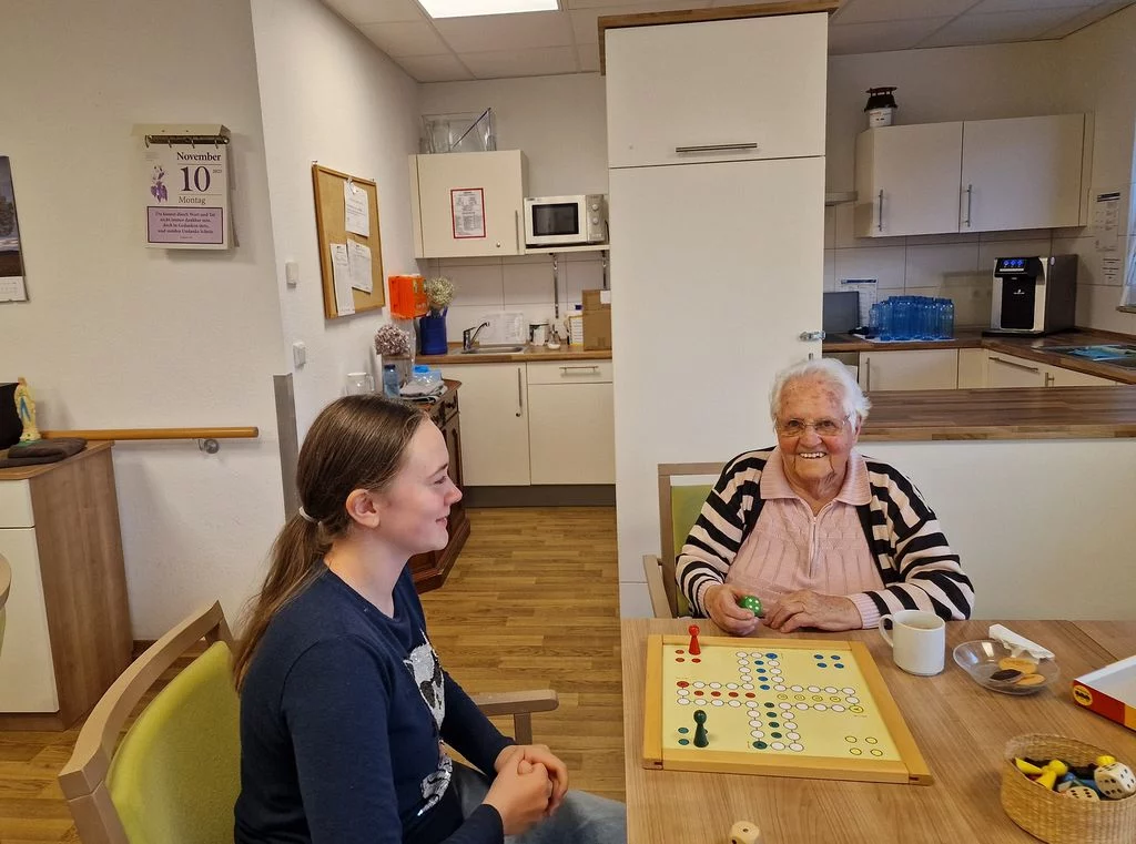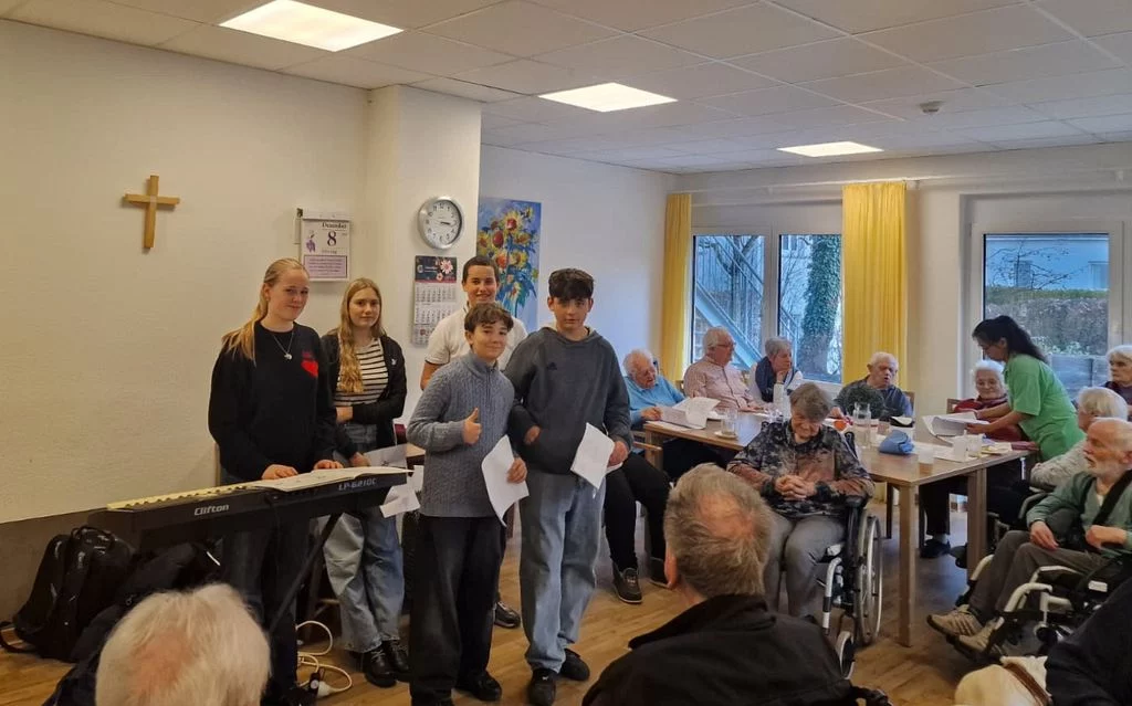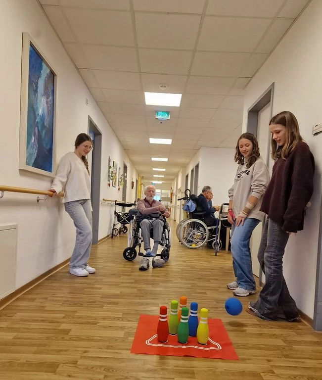 Die Sozial-AG gestaltete die letzte Zeit verschiedene Angebote für Seniorinnen und Senioren. Auf dem Programm standen (Brett-) spiele und Kegeln sowie gemeinsames Musizieren – anlässlich des bevorstehenden Weihnachtsfestes wurden zusammen Weihnachtslieder gesungen. Für große Begeisterung sorgte auch der Besuch von Merlin, des Hundes eines Schülers, der schnell die Herzen der Seniorinnen und Senioren eroberte und Erinnerungen an eigene Haustiere weckte.