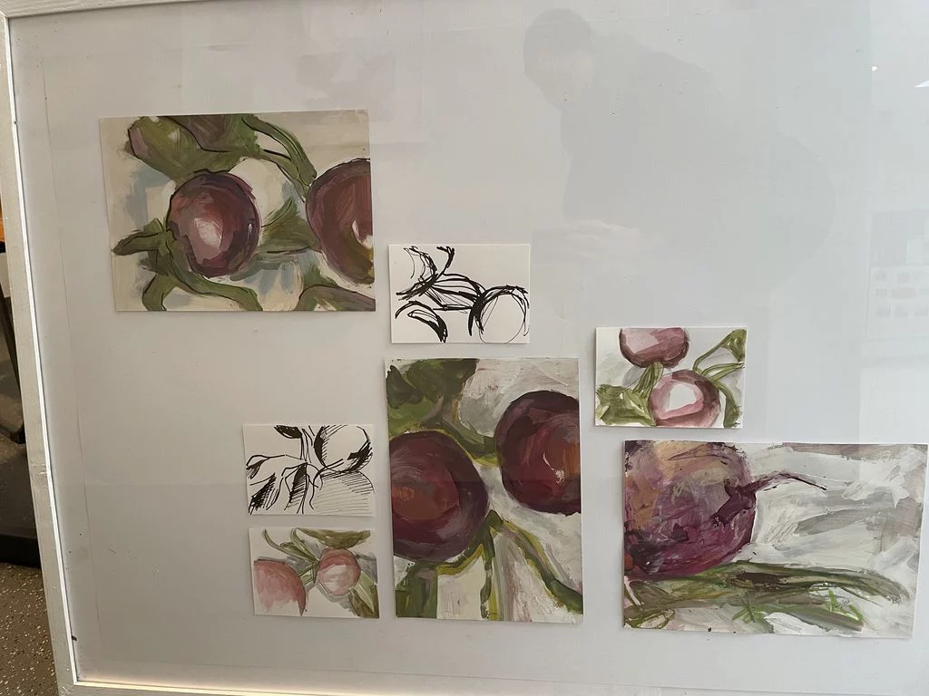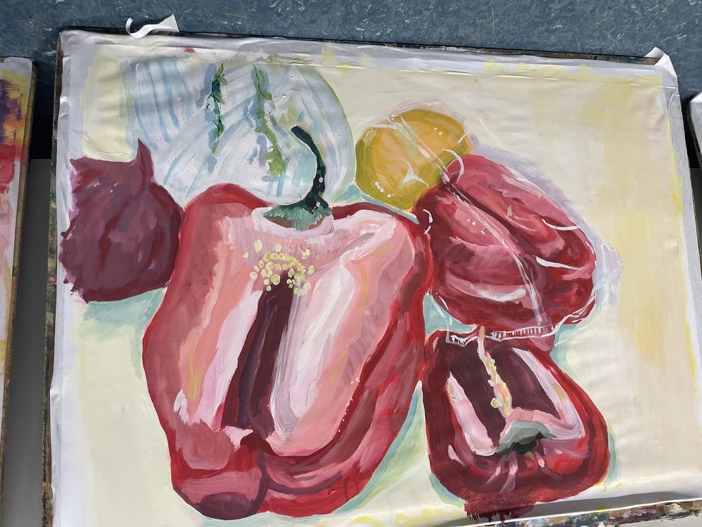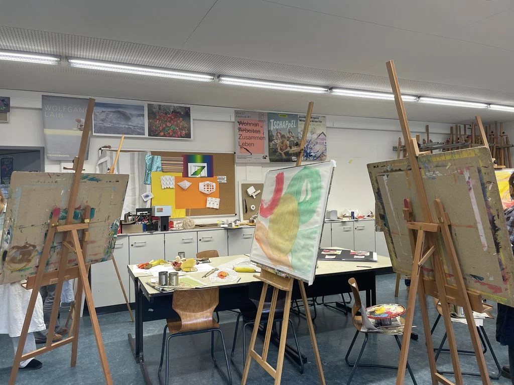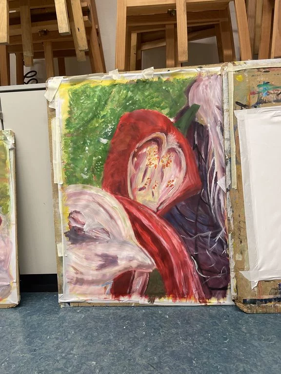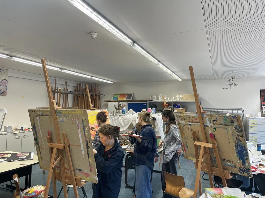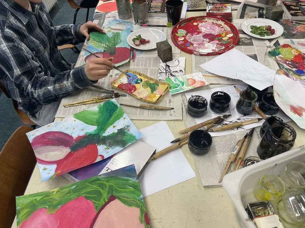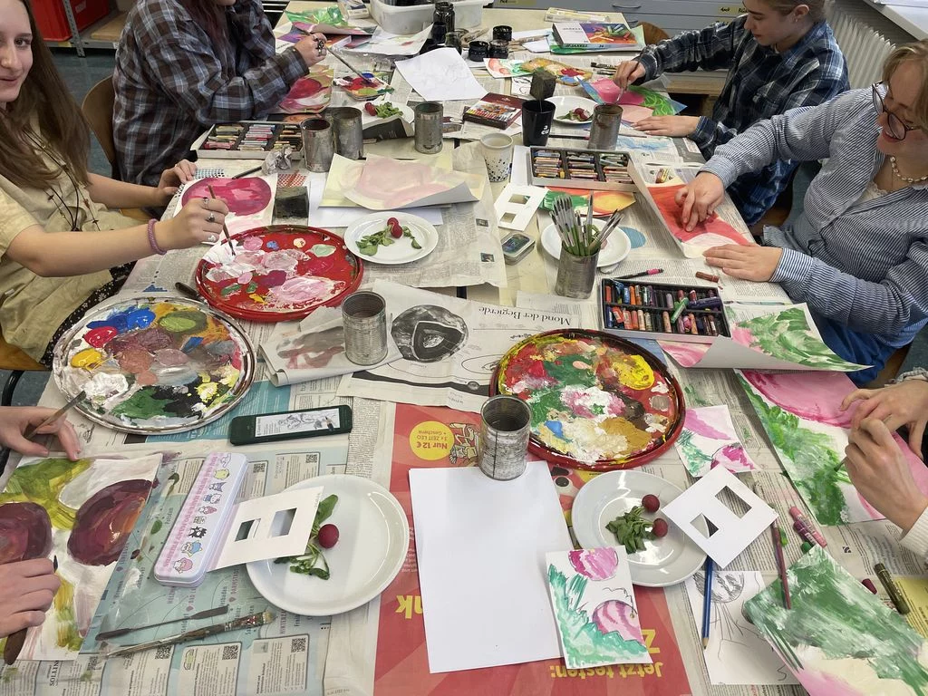 Freitags gleich nach der Schule – Pause machen oder gleich 5h malen? Das war keine Frage für die Schülerinnen der Jahrgangsstufe 2 im Leistungsfach Kunst: Natürlich malen! Nur außerhalb des doch engen Schulrahmens von maximal 1,5h können solche Erfahrungen gesammelt werden, die direkt auf das fachpratische Abitur vorbereiten. So investierten die Schülerinnen den Freitag nachmittag und den ganzen Samstag inmitten einer heißen Klausurenphase, um sich in verschiedenen Techniken, Kompositionsübungen, serieller Arbeit, intensiven Besprechungen zu üben und sich einmal einer langen Aufgabe zu stellen. Dabei wurde Gemüse und Obst aufgeschnitten, arrangiert und großformatig gearbeitet. Eine besondere Herausforderung war der Beginn mit dem Schwamm ( Farbe auf dem ganzen BIld in 5 Minuten) und die großen Pinsel. Viel Spaß hat es gemacht, aber anstrengend war es doch! Tee, Kaffee, Kekse und Pizza sorgten für Pausen, gegenseitige Besprechungen oder Wechsel von Aufgaben für Abwechslung. Prima, wenn man dabei nicht nur wertevolle Erfahrungen macht, sondern die Ergebnisse sich auch sehen lassen können, lobt die Kunstlehrerin Frau Oesterle. Seit gestern sind einige der Arbeiten im Schulhaus zu sehen.