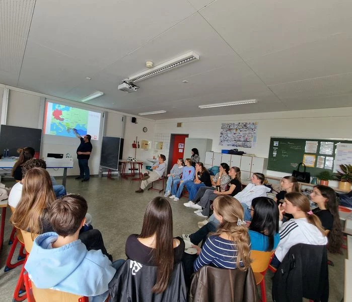 Im Mittelpunkt des Vormittags stand das Kennenlernen und der persönliche Austausch mit Mulham, einem Mann aus Syrien, der nach Deutschland geflüchtet ist. Offen und bewegend berichtete er von seiner Flucht, seinem Ankommen in Deutschland und den Herausforderungen, mit denen er hier konfrontiert war. Seine Geschichte machte deutlich, was es bedeutet, die Heimat zu verlassen – und wie wichtig Unterstützung und Offenheit in der neuen Umgebung sind. Die Schülerinnen und Schüler hatten dabei die Möglichkeit, Mulham Fragen zu stellen, was sie mit großem Interesse und Offenheit auch nutzten.