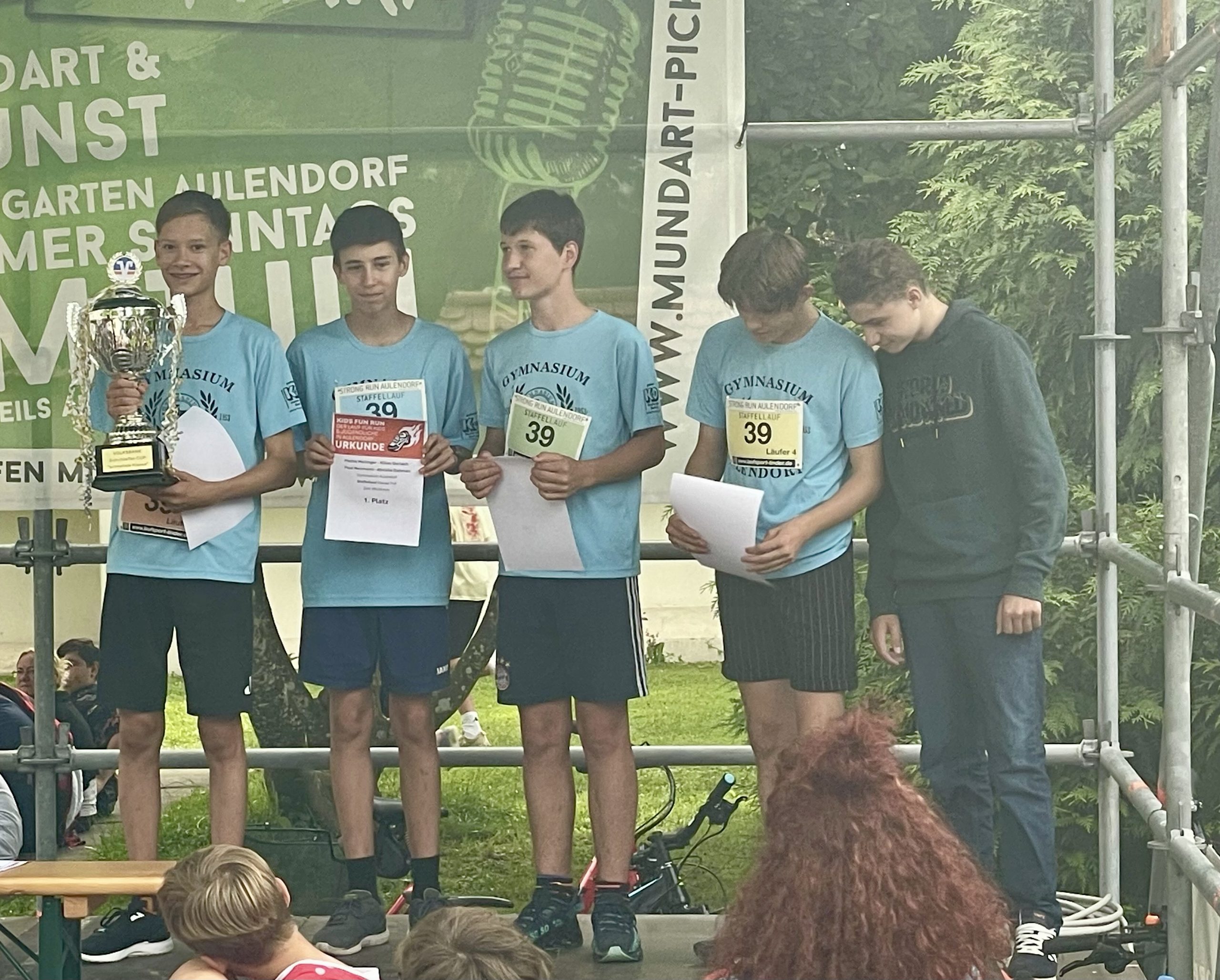 Der diesjährige Kids Fun Run im Aulendorfer Schlosspark gestaltete sich für die Läufer des Gymnasiums sehr erfolgreich. Im Lauf der Klassen 5/6 kamen gleich zwei Staffeln auf das Podest, wobei die Staffel der Klasse 6 den Alterklassensieg errang.