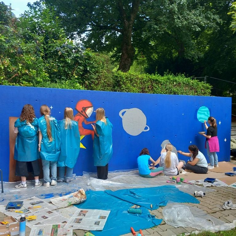 Etwas zusammen machen, das war die Idee, die diesem gemeinsamen Kunstprojekt zu Grunde liegt. Street Art auf einer Wand beim Schulhaus – ein motivierendes Projekt, und davon haben alle etwas. Das ganze Jahr haben die Kunstlehrerinnen der Schule am Schlosspark, Nina Guidi, und die des Gymnasiums, Angela Oesterle, an dem schulübergreifenden Projekt geplant, dann ging es in den letzten zwei Wochen des Schuljahres ganz schnell. Schon vor einem halben Jahr hatte die VKL der Schule am Schlosspark Entwürfe hergestellt, von denen einer dann von der VKL, der Klasse 9 der Schule am Schlosspark, und dem Leistungsfach BK des Gymnasiums umgesetzt wurde. In der vorletzten Schulwoche wurde gemeinsam geplant, spät abends das Motiv übertragen(LF BK Gym), grundiert (VKL) und in der letzten Woche am Projekttag der Schule am Schlosspark vormittags gemalt, anschließend bis abends vom LF BK Klasse 11 fertiggestellt. Jetzt fehlen nur noch die Namen aller Mitwirkenden, die dann nach den Sommerferien verewigt werden.