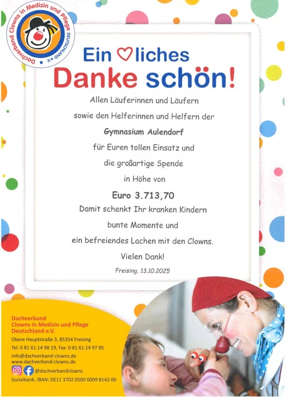 Nun haben sich die Klinikclowns nochmals bei uns gemeldet und sich mit einer Urkunde für diesen großen Einsatz bedankt!