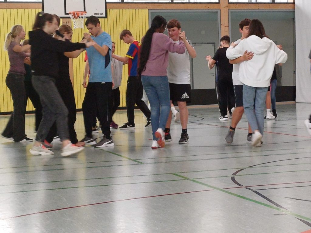 Was läge daher näher, als den Schülern der Klasse 9 alternativ zum Sportunterricht im Rahmen einer Schnupperstunde nahe zu bringen, was es bedeutet sich im Takt zu Musik zu bewegen und wie anspruchsvoll es ist, körperliche Bewegung und Musik in Einklang zu bringen. Die Grundschritte des Foxtrott oder Walzers wurden von Tanzlehrerin Janine eingeführt und von den Schülern zuerst einzeln eingeübt und dann mit einem Partner umgesetzt. Erste Erfolge stellten sich schnell ein, koordinative, kognitive und rhythmische Fähigkeiten wurden teilweise enorm strapaziert und oft bis zur Grenze ausgereizt. Insgesamt machten alle Schüler jedoch eine sehr gute Figur bei ihren teilweise ersten Tanzschritten überhaupt!